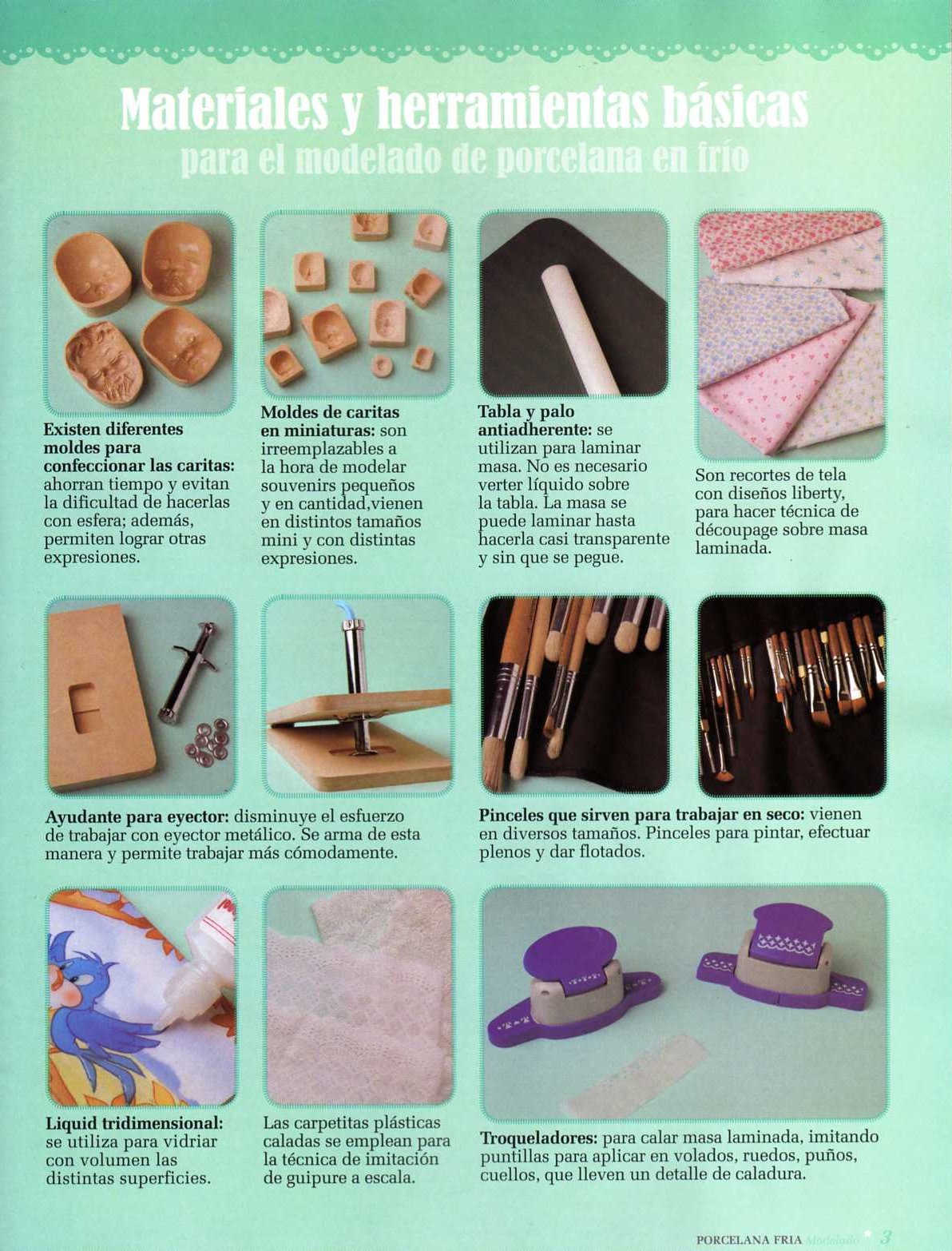 las herramientas o materiales que se necesitan para modelar en masas moldeables como porcelana fria,epoxy,sculpey,fimo o polymer clay o ladoll todas necesitan ciertos materiales que le facilitaran mejor el trabajo.